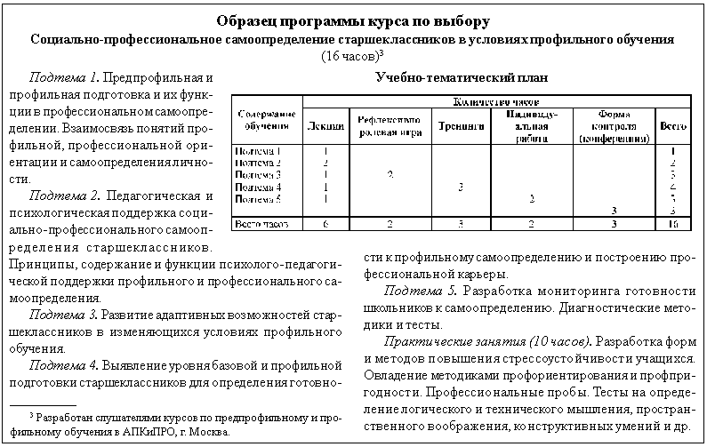 - знакомят на практике со спецификой типичных видов деятельности, соответствующих наиболее распространенным профессиям. В частности, курсы по выбору могут знакомить ученика со спецификой видов деятельности, которые будут для него ведущими, если он совершит выбор той или иной сферы профессиональной деятельности (историк, филолог и др.). Например, работа с литературными текстами, анализ исторических источников, использование правовых документов, анализ информации, решение проблемных задач в рамках образовательных ситуаций;